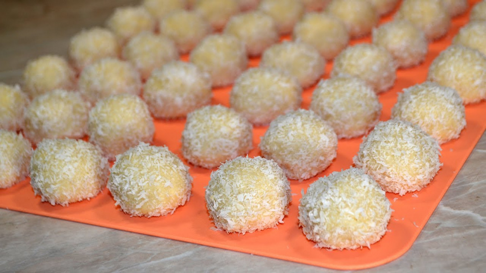 - Катаем шарики из основы с миндалем внутри и обваливаем в кокосовой стружке.