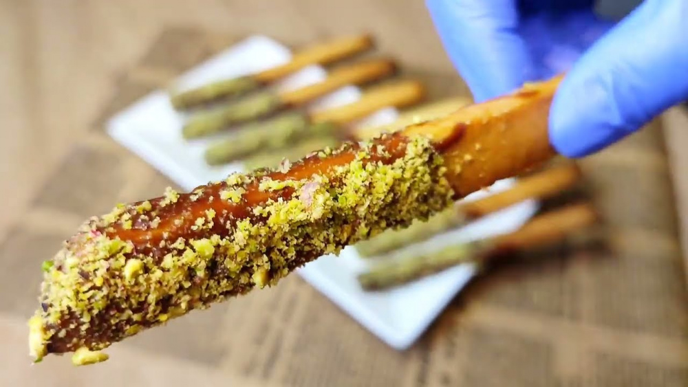 - Приготовление декора: Растопите молочный шоколад на водяной бане или импульсами в микроволновке (10–15 секунд). Сливки отдельно подогрейте, не кипятите. Добавьте сливки в шоколад и смешайте лопаткой. Полностью окуните палочку или только на ⅔ длины — как классические Pepero. Лучше держать палочку вертикально после окунания, чтобы лишний шоколад стек вниз. Пока шоколад не застыл, обвалять часть палочки в дробленых орехах. Сушите шоколад при комнатной температуре.
