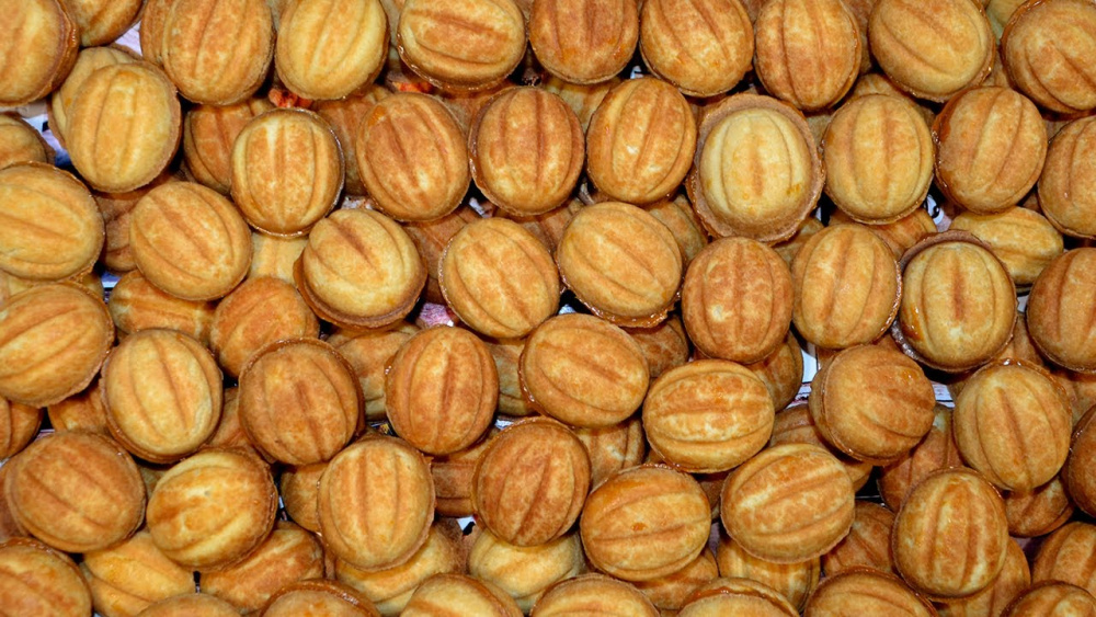 - Как только орешки остыли, начиняем каждую половинку вареным сгущенным молоком, соединяем половинки.