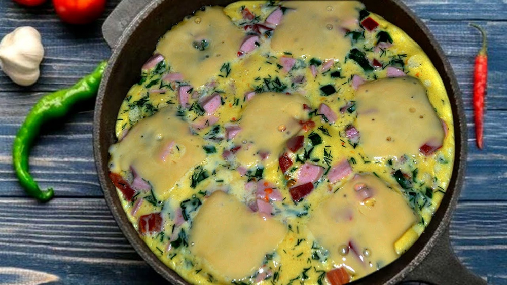 - Нагреваем сковороду, смазываем подсолнечным маслом, выливаем на сковороду все содержимое миски, накрываем крышкой и жарим 5 минут на маленьком огне.