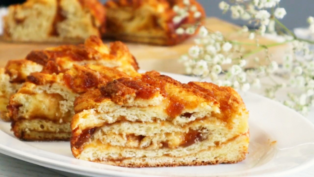 - Раскатать в пласт, смазать повидлом.