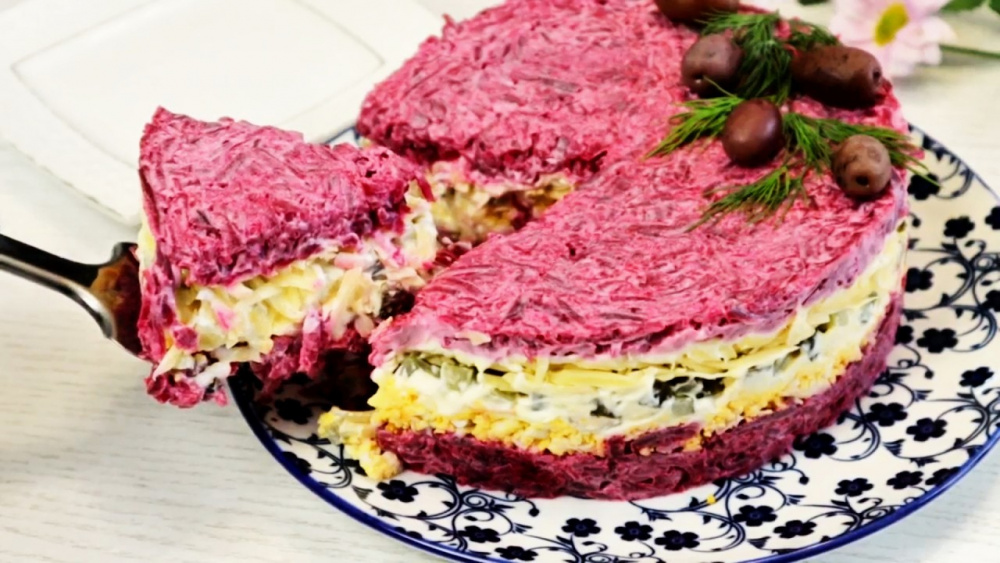 - Выложить слоями (в форме): свекла → яйца → майонез → огурчик → немного майонеза → сыр → свекла.