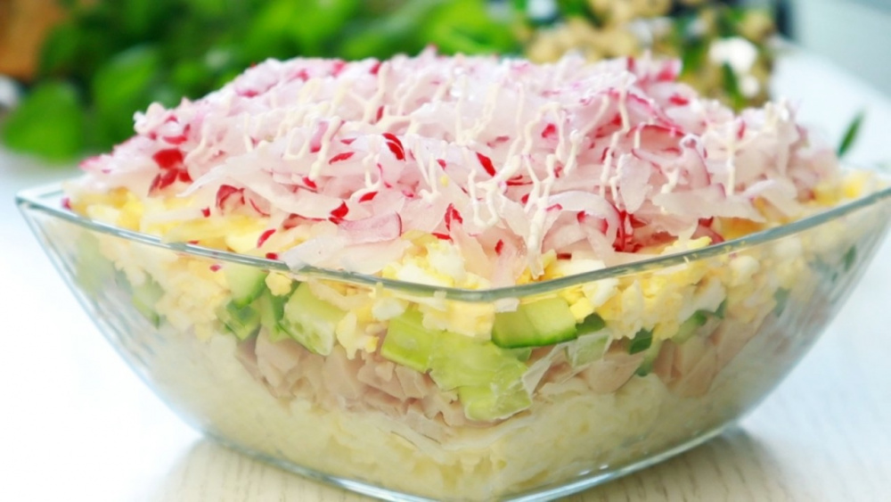 - Редис натереть на крупной тёрке (если сочный — слегка отжать) и выложить финальным слоем