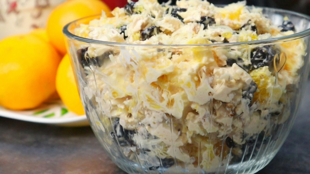 Сочетание просто вау: нежная курица, сладкий апельсин, сочный чернослив, ароматные орешки и сыр — настоящий праздничный взрыв вкуса!