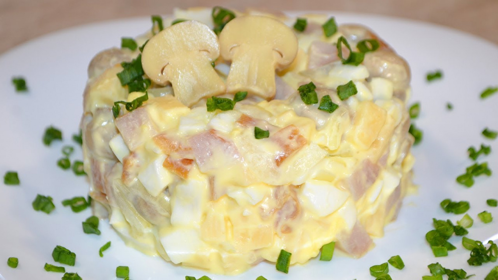 - Перемешиваем копченую куриную грудку, сыр, яйца, маринованные шампиньоны и лук, соль и майонез.