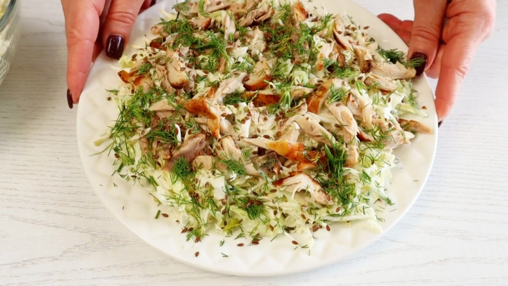 - Сверху разложить тёплую курочку, посыпать зеленью и слегка присыпать семенами льна.