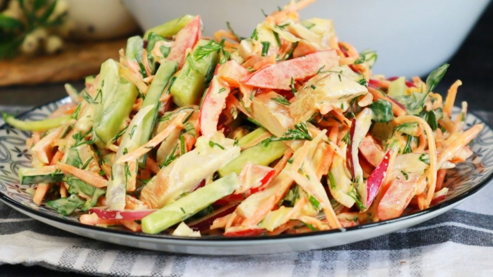 - Аккуратно перемешать — салат должен быть сочным, но не «плавать» в соусе.